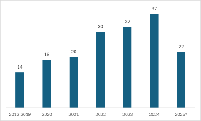 2025种子100强公司自2012年起涉及的转让、合作、被收购(项目/公司)及复合型交易共174项,交易活跃度自2022年显著增加,随后保持增长。