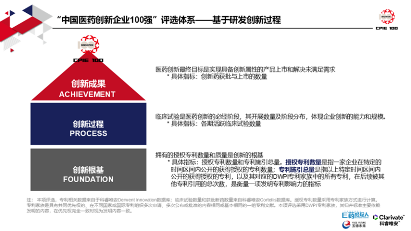 “种子100强”榜单延续了“创新100强”的基本研究框架,以创新根基、创新过程、创新成果为主要评价体系,在科睿唯安Cortellis竞争情报和临床试验数据及Derwent Innovation专利数据基础上,通过对授权专利数量和专利施引总量、在研临床试验数量、获批与上市新药数量指标进行统计处理,遴选出100家上榜企业。