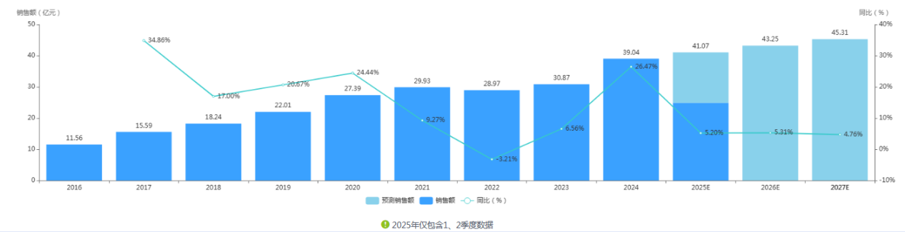 从年度销售额的变化趋势来看,醋酸戈舍瑞林缓释植入剂呈现出稳步增长的态势。2016年该药物实现销售额11.6亿元,2019年销售额突破20亿元大关,迈入新的增长阶段,2023年销售额成功突破30亿元,2025年上半年仅半年时间实现24.9亿元销售额,按照这一增长节奏,药智数据预测2025年其全年销售额将突破40亿元,增长潜力持续释放。
