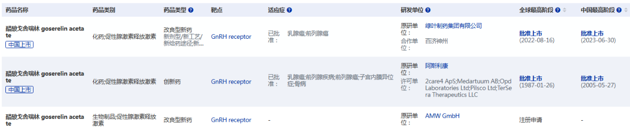 戈舍瑞林由阿斯利康研发,2015年2月,获得美国FDA批准用于晚期前列腺癌的治疗。1996年,阿斯利康的戈舍瑞林缓释植入剂进入中国,商品名为诺雷得。