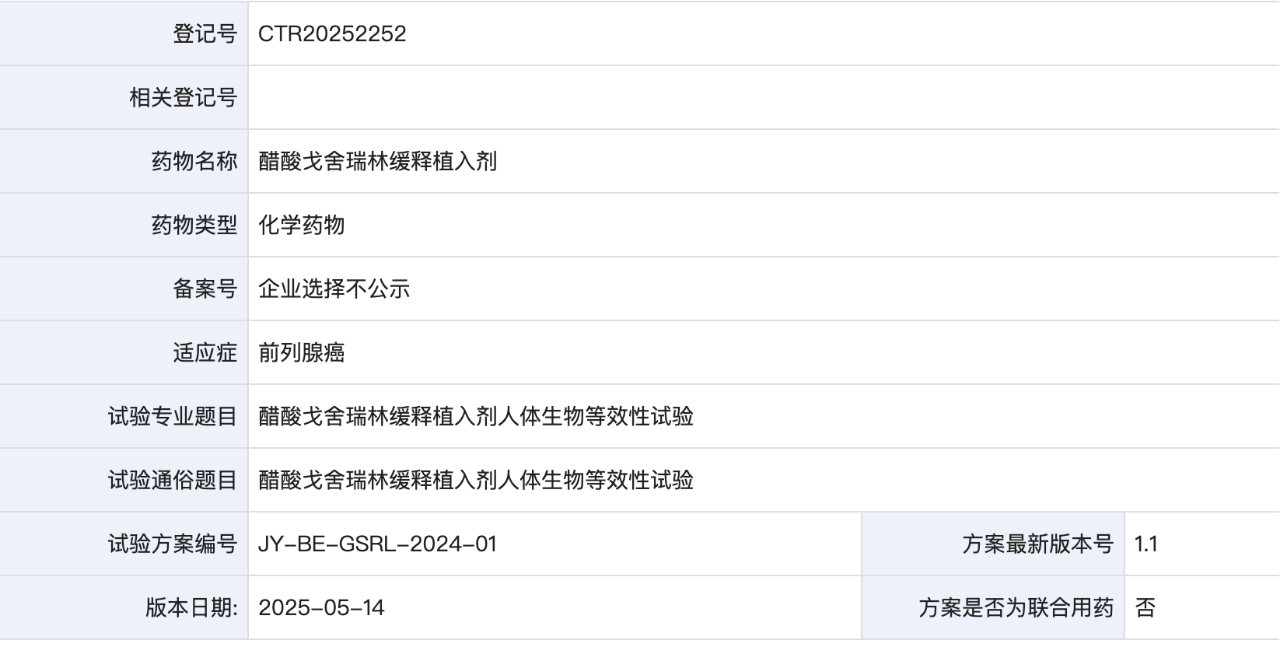 正因如此,原研药诺雷得至今仍独占市场。然而,国内药企的探索并未止步。近日,四川汇宇制药登记了一项醋酸戈舍瑞林缓释植入剂的BE试验(CTR20252252),此次BE试验的参比制剂选择的是原研未进口的参比制剂,即由TerSera Therapeutics LLC持证的醋酸戈舍瑞林缓释植入剂,规格为3.6mg/支。
