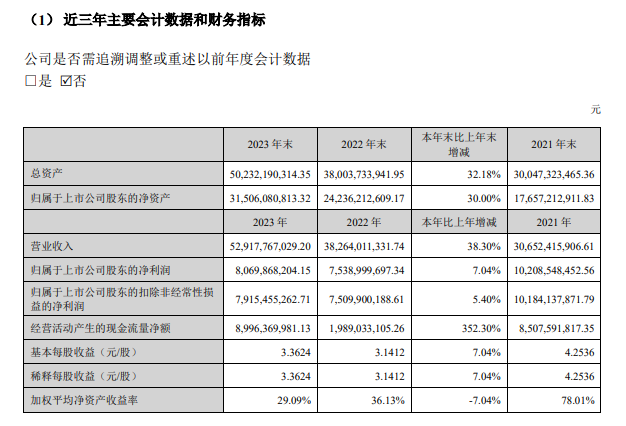 4月22日晚间,智飞生物(SZ 300122,收盘价:40.21元)发布年度业绩报告称,2023年营业收入约529.18亿元,同比增加38.3%;归属于上市公司股东的净利润约80.7亿元,同比增加7.04%;基本每股收益约3.36元,同比增加7.04%。经营活动产生的现金流量净额89.96亿元,同比增长352.30%,公司在年报中表示现金流量净额增加是本期销售回款增加所致。(推荐阅读:疫苗大王智飞生物,杀入千亿美金减肥药赛道!)