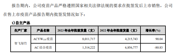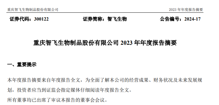 同一时间披露的《智飞生物2024年第一季度报告》显示,公司一季度营业收入达113.96亿元,净利润达到14.58亿元,营收同比微增,净利润略有下滑。