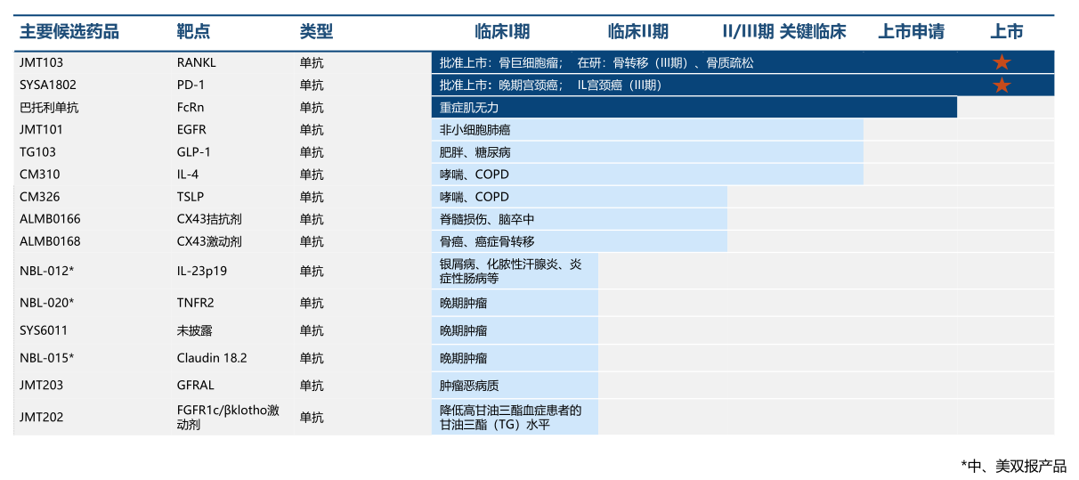 JMT103:纳鲁索拜单抗注射液,2024年3月,在中国启动用于治疗恶性实体瘤骨转移的Ⅲ期试验,目前处于入组阶段。