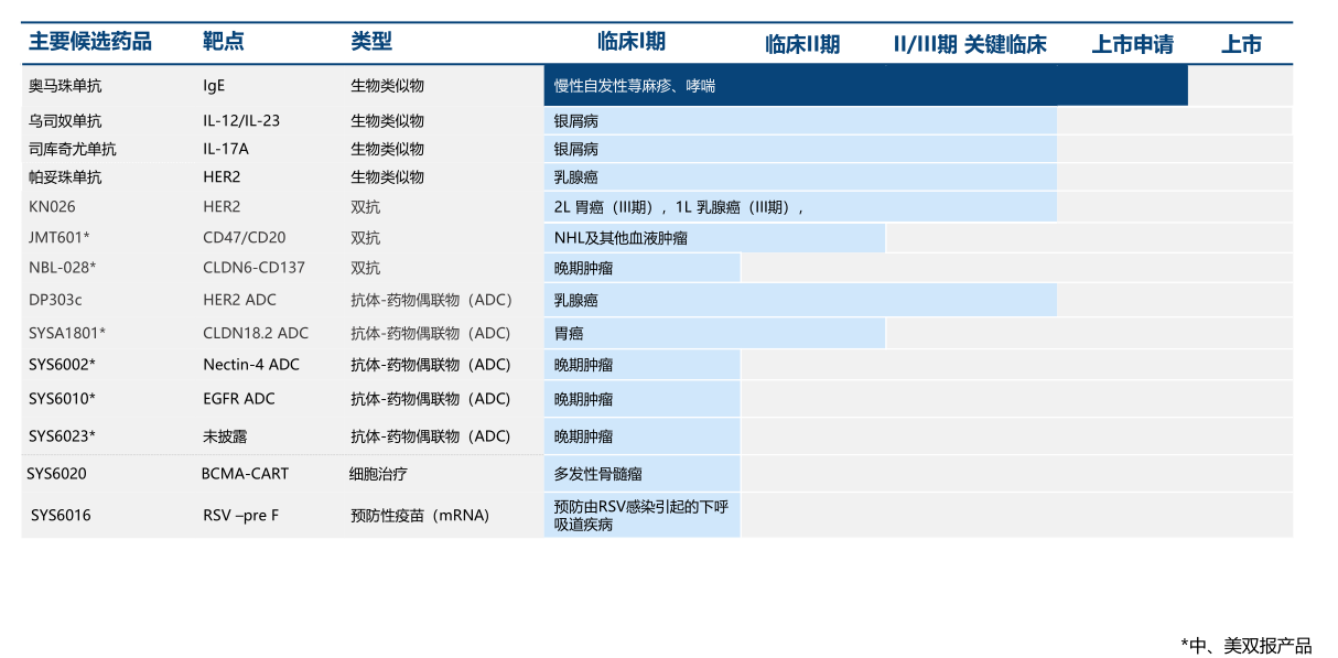 SYS6023:一款单克隆抗体药物偶联物,可与肿瘤表面的特异性受体结合,通过内吞作用进入细胞并释放毒素,达到杀伤肿瘤细胞的作用。7月,获FDA批准开展临床,获批临床的适应症为晚期实体瘤。