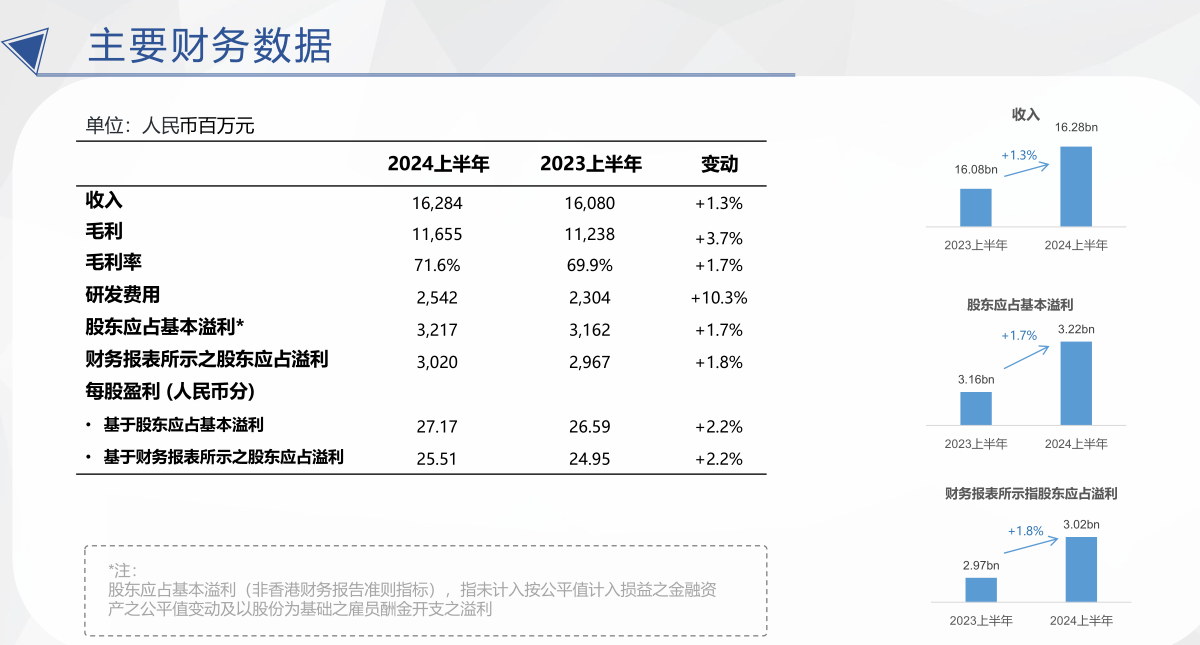 8月21日,石药集团发布了 2024 年上半年财报。根据财报,石药集团H1收入为 162.84 亿元,同比增长 1.3%,研发费用25.42亿元,同期增长10.3%。