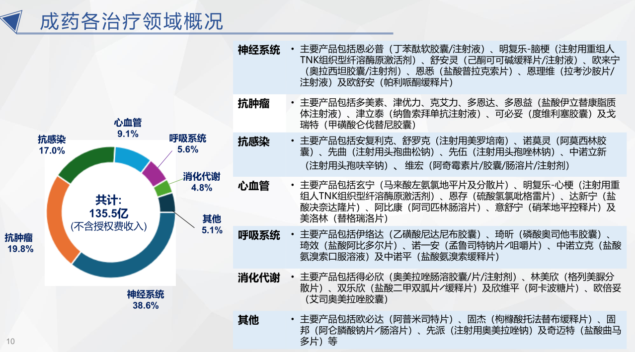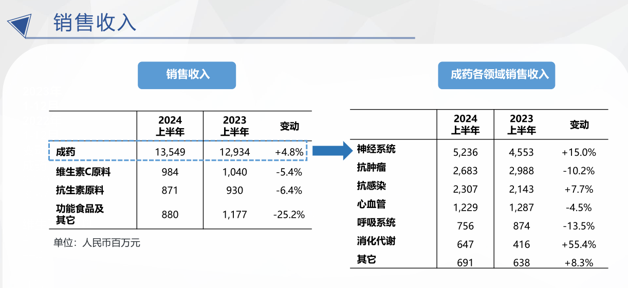 其中,成药业务收入为 135.49 亿元,同比增长 4.8%,对比Q1有所降速,主要因为NBP稳健增长,但肿瘤线阶段性承压于区域联盟集采。