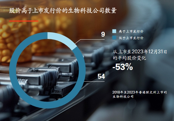 来自《2024年香港上市生物科技公司报告》的数据显示,2018—2023年,港股上市的63家生物科技公司中只有9家的股价高于上市发行价。从上市至2023年12月31日,所有公司的平均股价变动幅度为下跌53%。