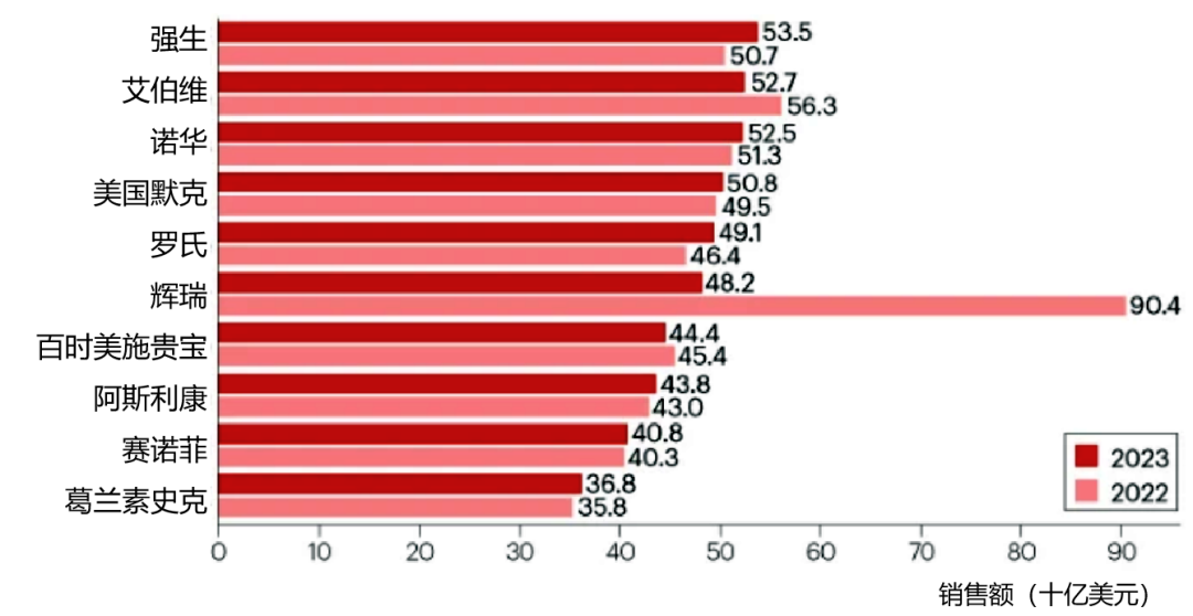 长期榜一大哥Humira(阿达木单抗)销售额下降使得艾伯维销售收入比2022年下降了超过35亿美元,但仍能保持第二名。尽管如此,Humira仍然是2023年销量第二高的产品,销售额超过140亿美元。对于艾伯维来说,至少这种逐渐衰退的产品可以通过其他新投资管线产品增长部分抵消。新冠疫情影响渐行渐远,2023年头部制药企业的座次也按照预期轮换,包括Humira的衰落和Keytruda的崛起,同时也让我们持续关注糖尿病/肥胖市场在未来几年内排名蹿升的高度。