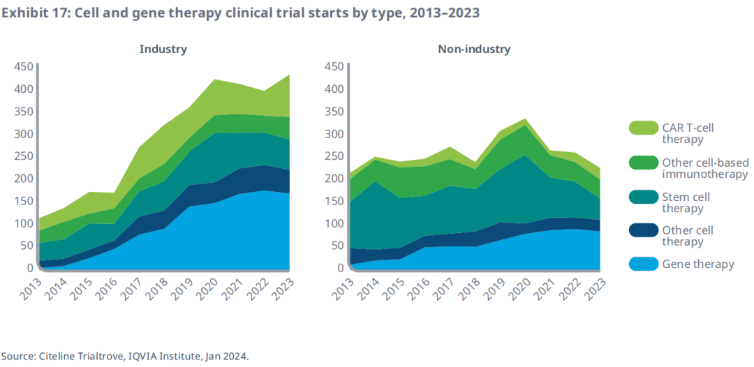 基于细胞的免疫疗法(包括CAR-T)主要集中于癌症治疗,并在血液瘤方面取得了成功。基因疗法通常侧重于遗传性疾病,为患有终生疾病或衰弱性疾病的患者带来希望。最近在美国和中国进行的不同研究中,成功地恢复了基因型听力损失儿童的听力。在细胞和基因治疗模式中,超过90%的试验是由学术机构和初创公司进行的,这凸显了这些团体在科学发现和开发新型治疗方案中发挥的重要作用。