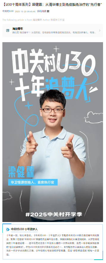 近日,中关村U30十周年专题报道聚焦华卫恒源创始人、清华博士梁健霖——这位在科研与产业交汇处勇敢突围的青年科学家,用十年时间将实验室成果转化为临床希望,成为中国细胞药物与免疫治疗领域的“先行者”。华卫恒源致力于以“免疫豁免细胞技术”突破再生医学与移植治疗的临床瓶颈。