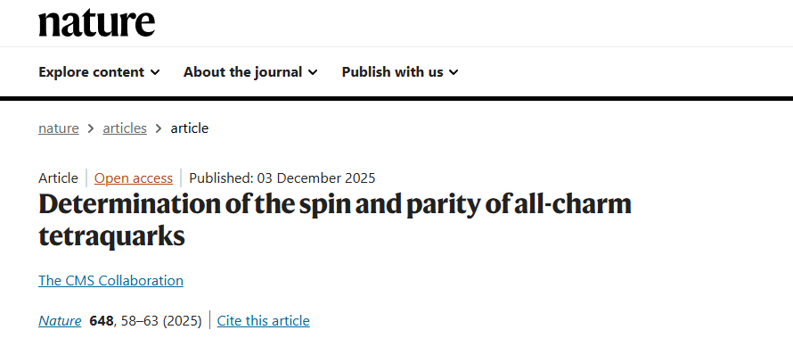 12月3日,由南京师范大学物理科学与技术学院易凯教授领衔的CMS联合团队在Nature期刊上发表研究论文“Determination of the spin and parity of all-charm tetraquarks”,揭示全粲四夸克家族及其量子特性。Nature官方网站同期进行新闻发布,并刊登专题评论文章。