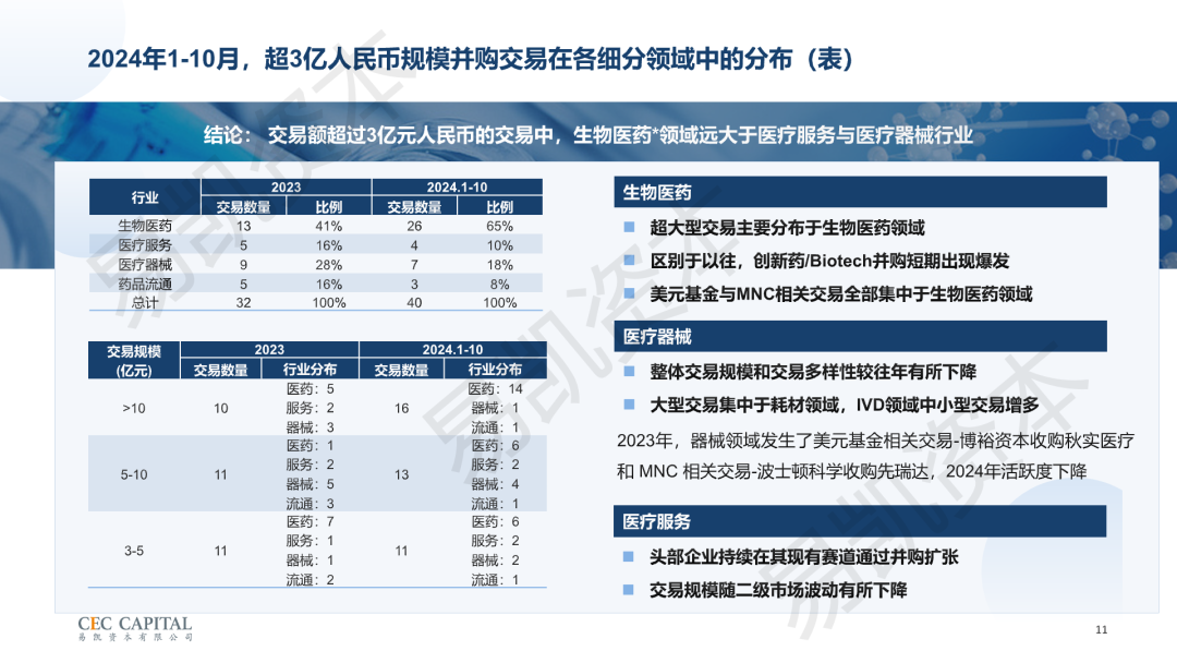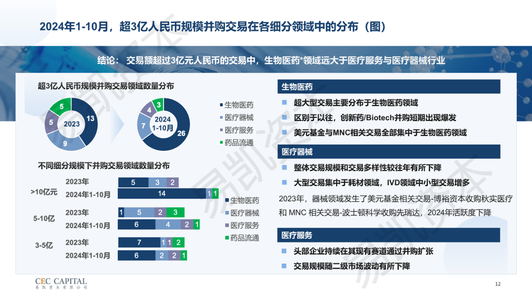 易凯资本是过去二十多年中国并购市场的亲历者和参与者。在医疗领域,其最早的一单医疗并购交易可追溯至2010年。与传统证券公司不同,易凯资本历史上作为卖方财务顾问,成功代表客户与A股上市公司、港股上市公司、跨国公司以及人民币与美元并购基金等买方完成了众多医疗领域的控股权交易。例如,骨科公司捷迈(Zimmer)收购蒙太因医疗器械有限公司,CRO公司Charles River收购维通利华,以及仿制药公司Teva收购华立达生物等。