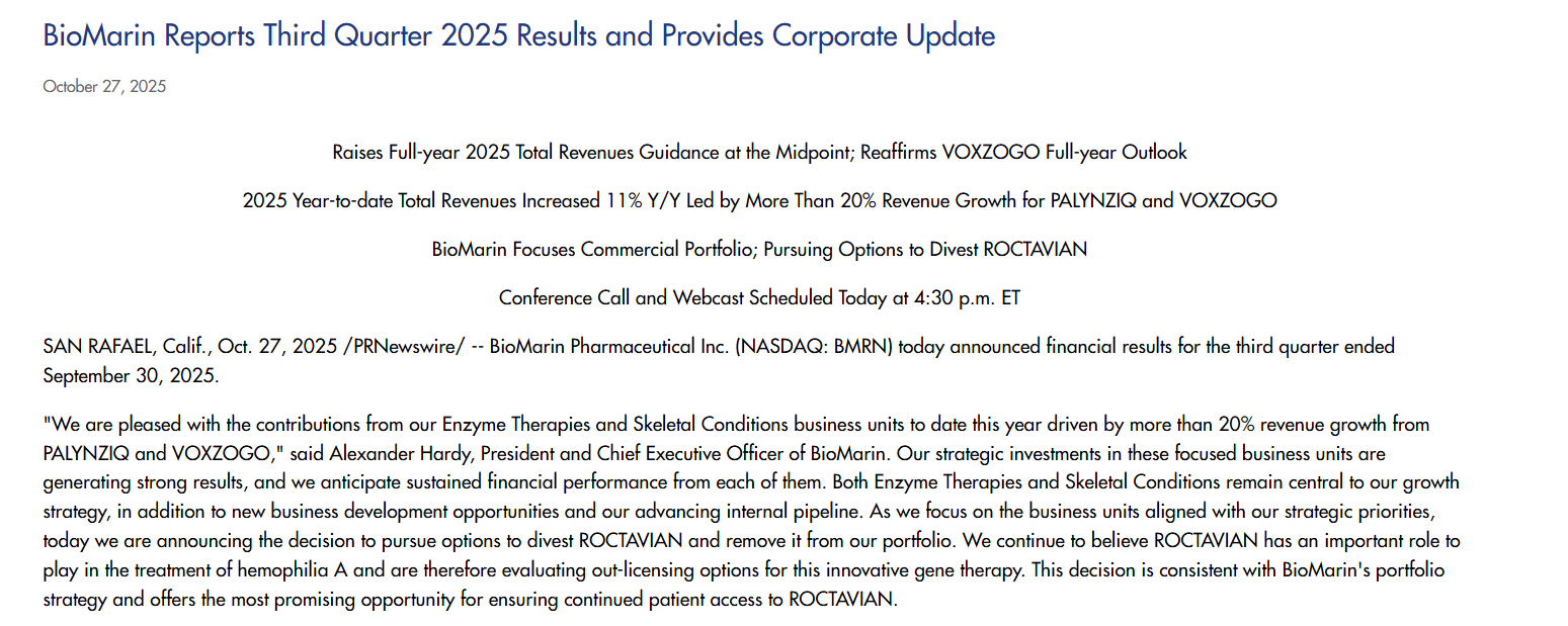 10月27日,BioMarin在2025年第三季度业绩报告中宣布:决定寻求剥离Roctavian的途径并将该药物从产品组合中移除。