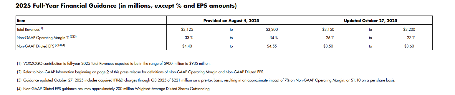 公司2025年第三季度的运营现金流总计3.69亿美元,年初至今的运营现金流为7.28亿美元。截至第三季度末,现金及投资总额约为20亿美元。第三季度,BioMarin 的产品收入为 7.76 亿美元,比去年同期增长4%。 该公司预计全年营收将在31.5亿美元至32亿美元之间,其中软骨发育不全治疗药物Voxzogo将贡献9亿美元至9.35亿美元。