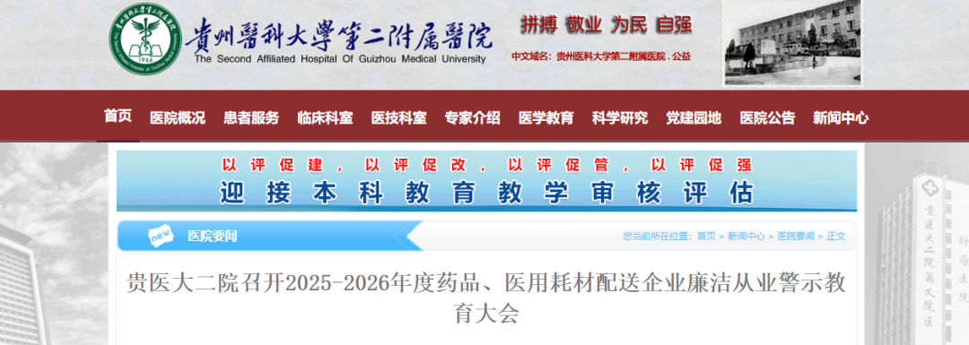 10月23日,贵州医科大学第二附属医院召开2025 - 2026年度药品、医用耗材配送企业廉洁从业警示教育大会,院领导、职能部门人员及相关配送企业代表参会。该院始建于1966年,是三级甲等综合医院,有两个院区,下辖1所法医学司法鉴定所和1所健康管理(体检)中心。