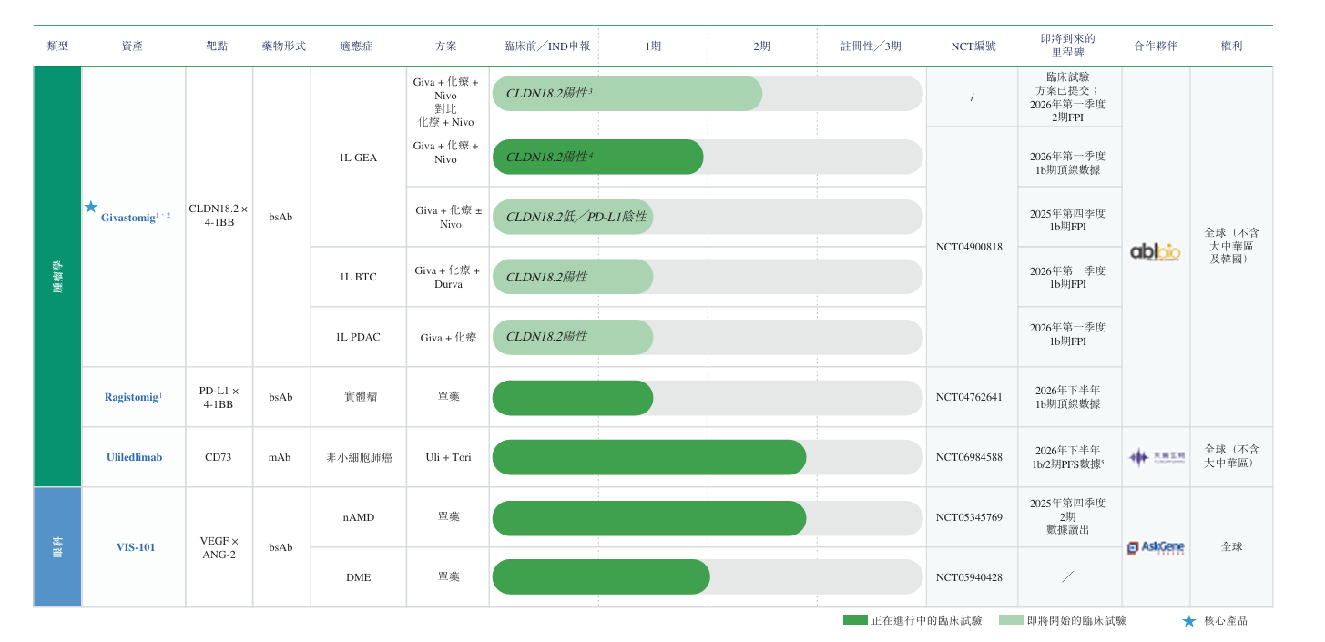 - Ragistomig是一款抗PD-L1×4-1BB的双特异性抗体。基于一期临床数据,目前开展的1b期研究旨在扩大治疗窗口,预计将在2026年下半年产生结果。该项目正与ABL Bio联合开发。