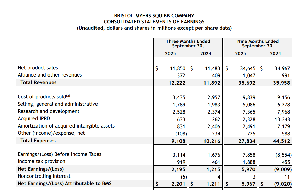 10月30日,BMS公布2025第三季度业绩,前三季度累计收入为356.92亿美元,同比下降1%。2025 Q3营收122.22亿美元,同比增长3%;其中美国收入为83亿美元(+1%),国际地区收入为39亿美元(+6%);研发投入25亿美元,同比增长6%。