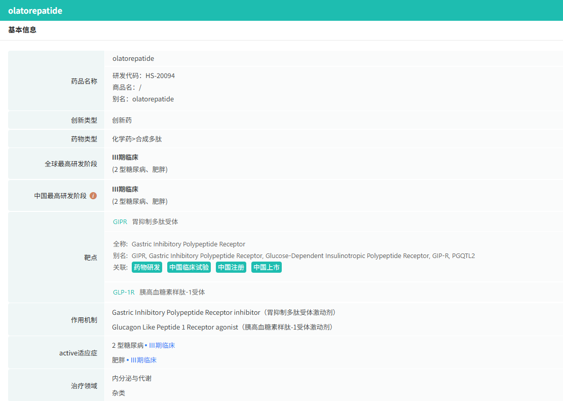 HS-20094是翰森制药自主研发的一款在研GLP-1/GIP双受体激动剂,通过激活GLP-1和GIP受体,促进胰岛素分泌、延缓胃排空并抑制食欲,从而发挥控糖、减重及代谢改善等作用。其给药方式为每周一次皮下注射,目前已在中国开展肥胖症III期和糖尿病2b期临床试验。2025年6月2日,翰森制药与美国再生元(Regeneron)达成协议,授予后者HS-20094全球独占许可(不含中国内地、香港及澳门),交易总金额最高达20亿美元(含8000万美元首付款及19.3亿美元里程碑付款)。