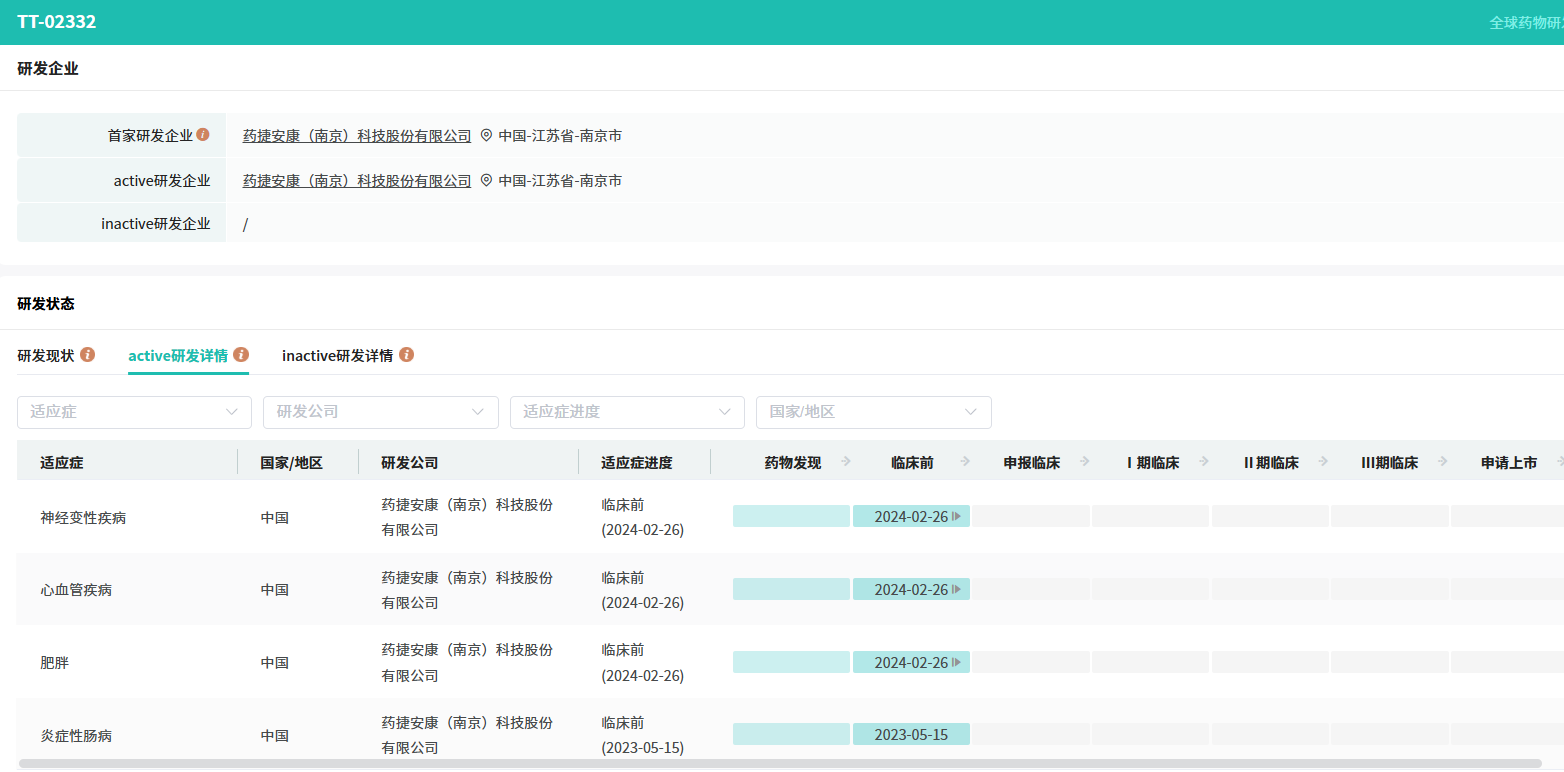 药捷安康专注于发现和开发肿瘤、炎症及心脏代谢疾病的小分子创新疗法,于今年6月23日在港交所正式上市。根据药捷安康公开资料,该公司开发的 TT-02332 是一种新型、高效、选择性的NLRP3抑制剂,拟开发用于治疗代谢/炎症疾病,目前处于临床前研究阶段。