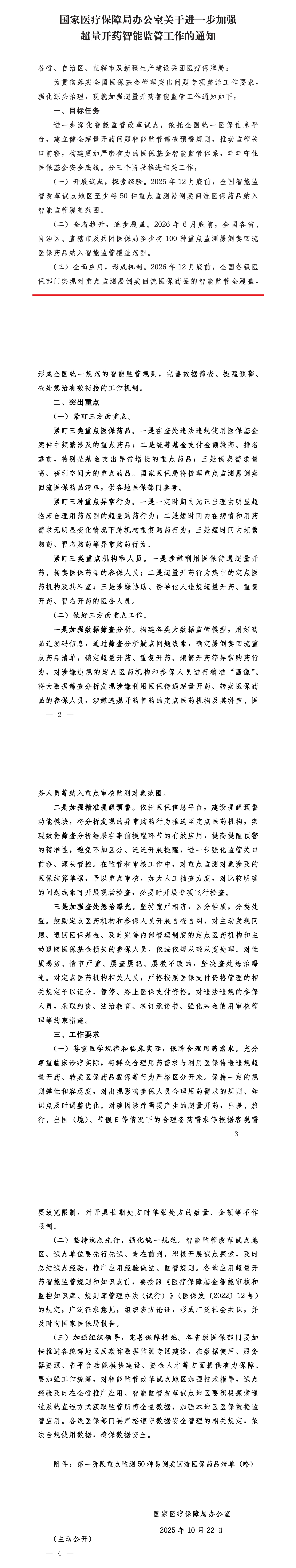 11月3日,国家医保局发布《国家医疗保障局办公室关于进一步加强超量开药智能监管工作的通知》,要求加强超量开药智能监管。