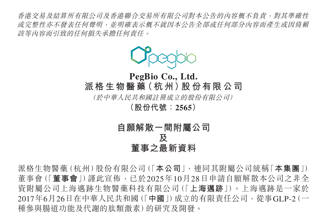 11月3日,派格生物医药-B(02565.HK)宣布,已于2025年10月28日申请自愿解散公司的非全资附属公司上海迈迹生物医药科技有限公司("上海迈迹")。上海迈迹是一家于2017年6月26日在中华人民共和国(「中国」)成立的有限责任公司,从事GLP-2(一种参与肠道功能及代谢的肽类激素)的研究及开发。