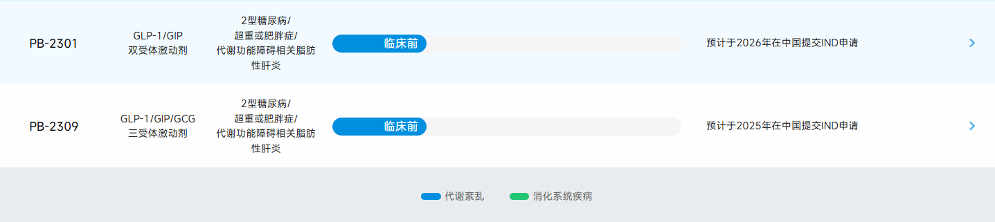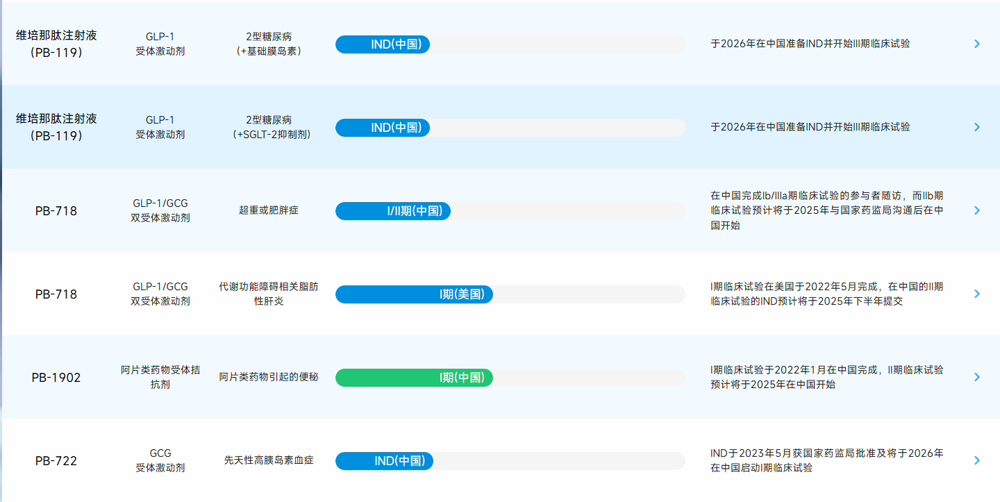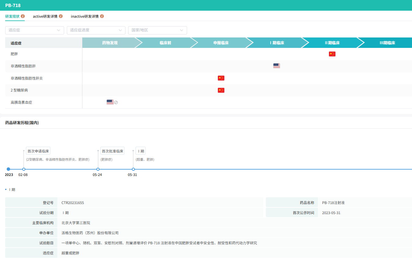 2022年5月,PB-718在美国完成了I期临床试验,2023年7月启动了一项中国治疗肥胖症Ib/IIa期临床试验,计划于2025年下半年向国家药监局提交IND申请以在中国开展治疗NASH的II期临床试验。