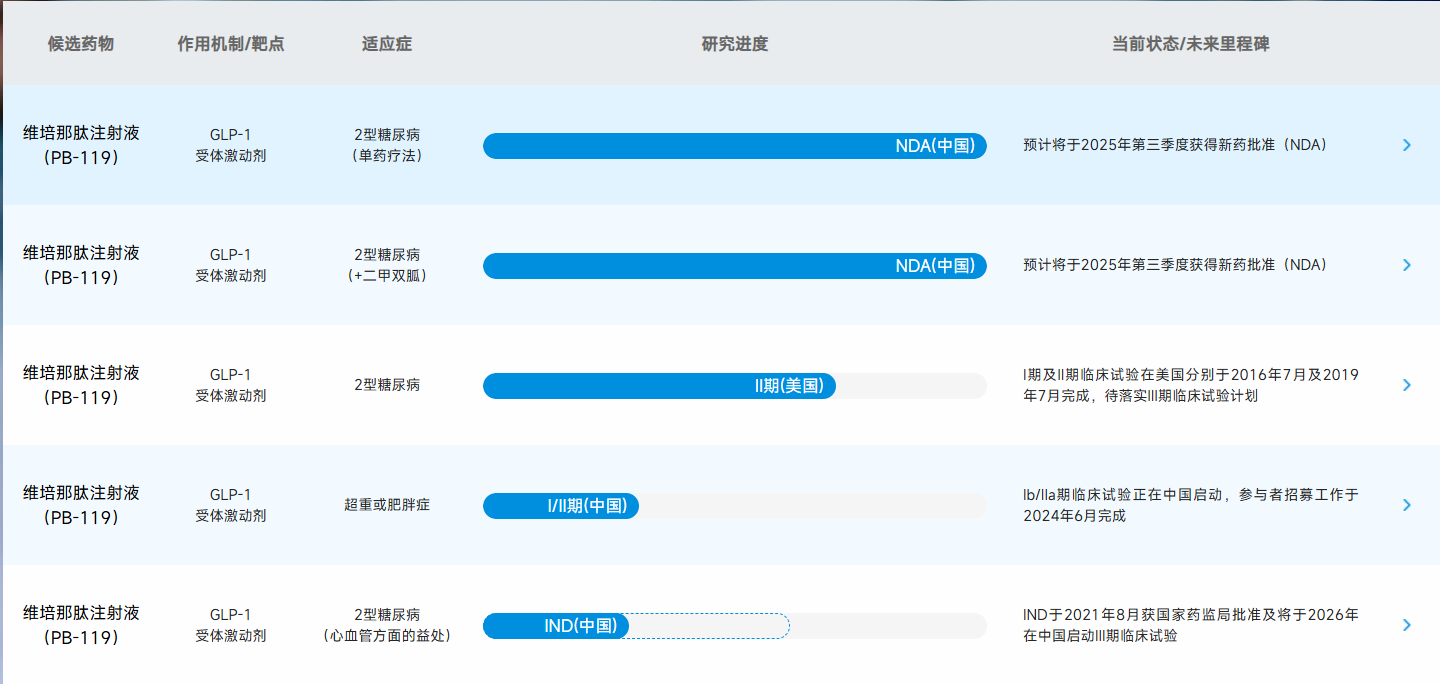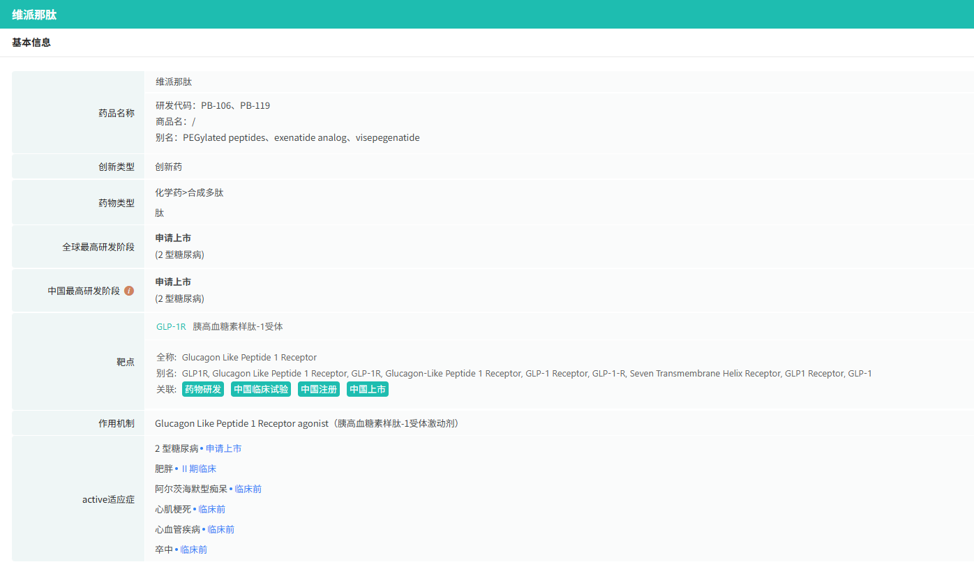 据摩熵医药数据库显示,PB-119是一款派格生物自主开发、接近商业化阶段的长效GLP-1受体激动剂,主要用于2型糖尿病(T2DM)及肥胖症的一线治疗。