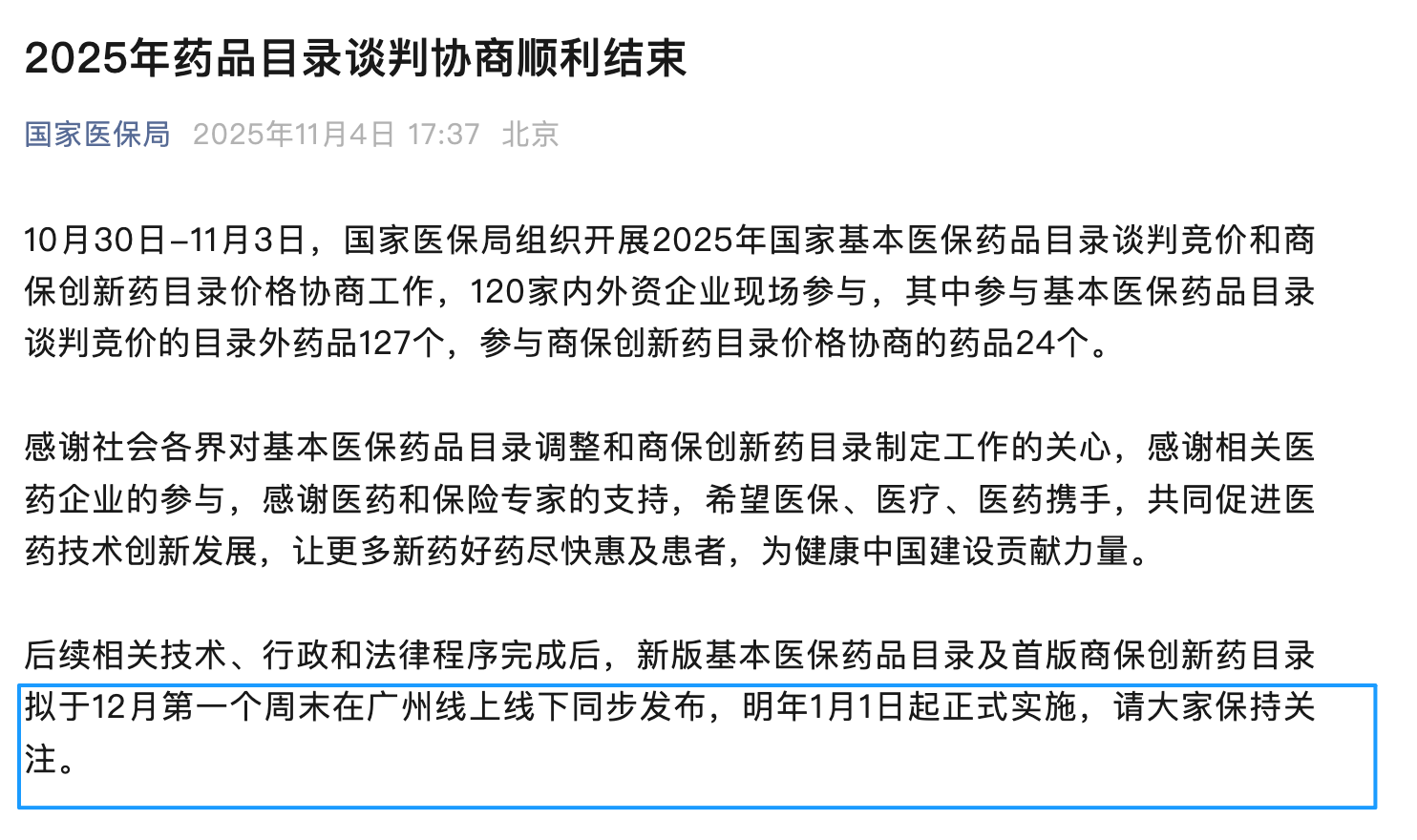 后续相关技术、行政和法律程序完成后,新版基本医保药品目录及首版商保创新药目录拟于12月第一个周末在广州线上线下同步发布,明年1月1日起正式实施,请大家保持关注。