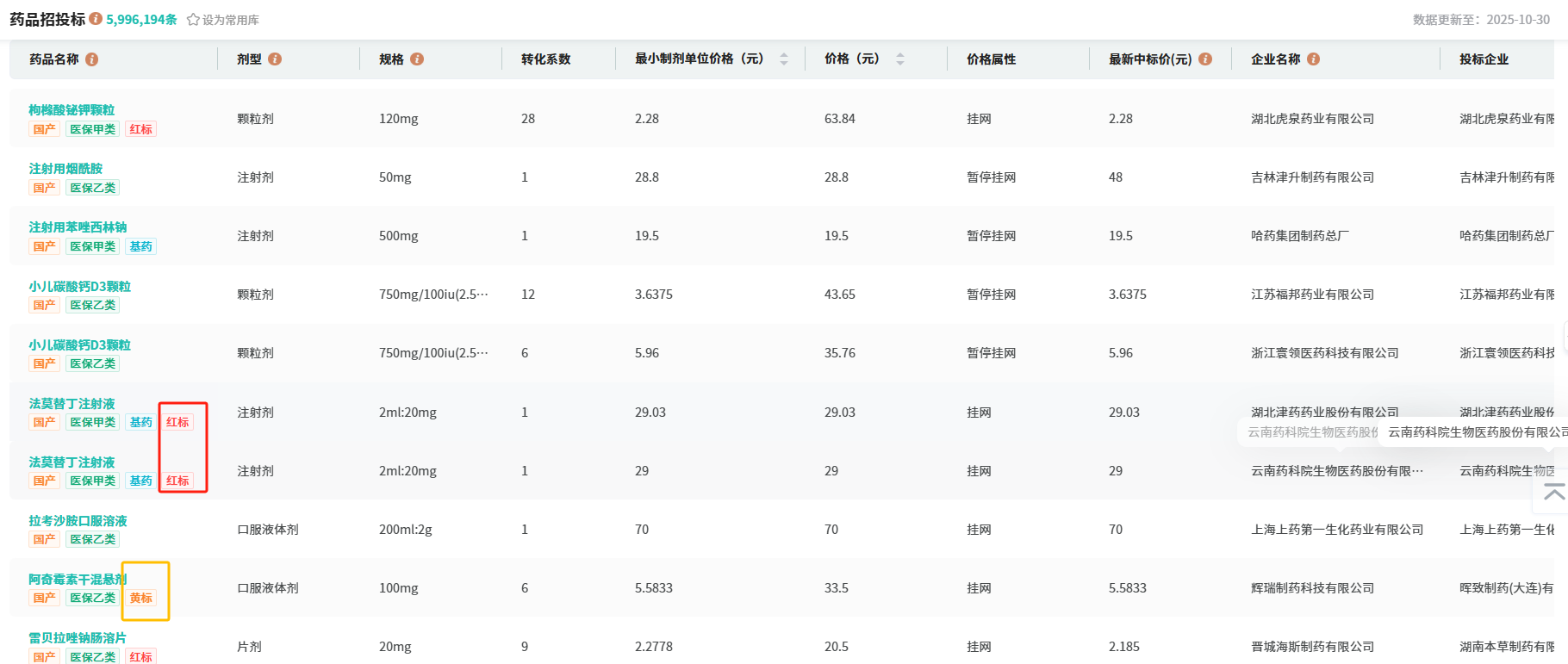 此外,药品信息展示列表同步直观呈现相应红黄标标签,便于用户快速区分药品价格区间,为药品招投标决策提供更直观、高效的参考依据。
