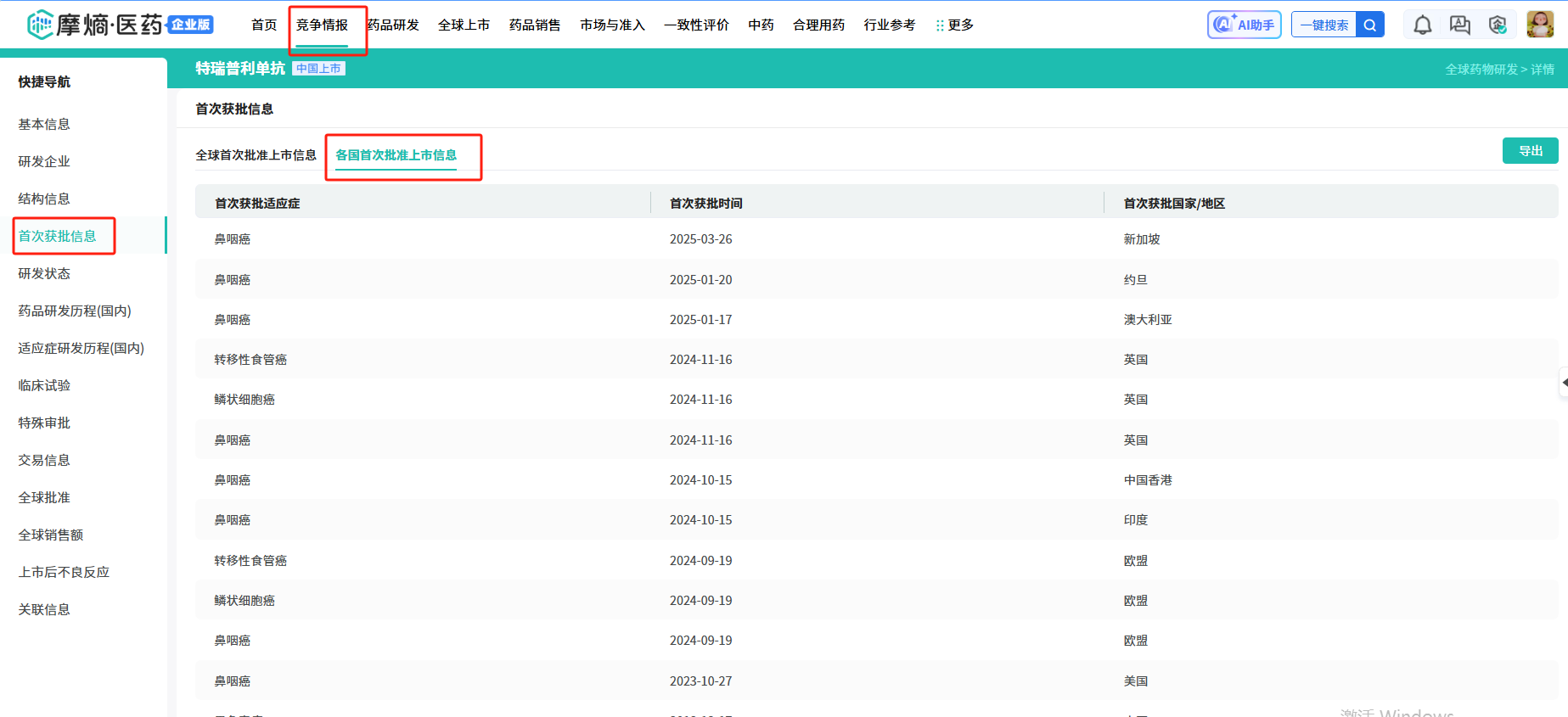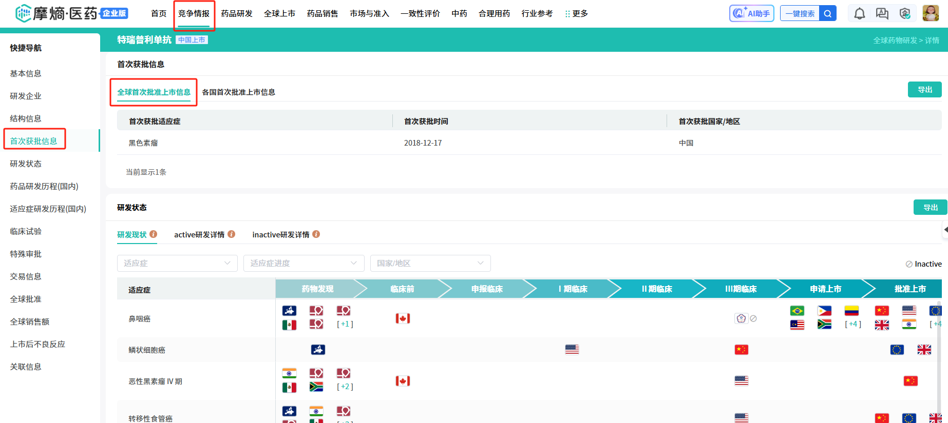 药品详情页新增【首次获批信息】展示版块,系统整合了药品在全球及各国家的首次批准信息。