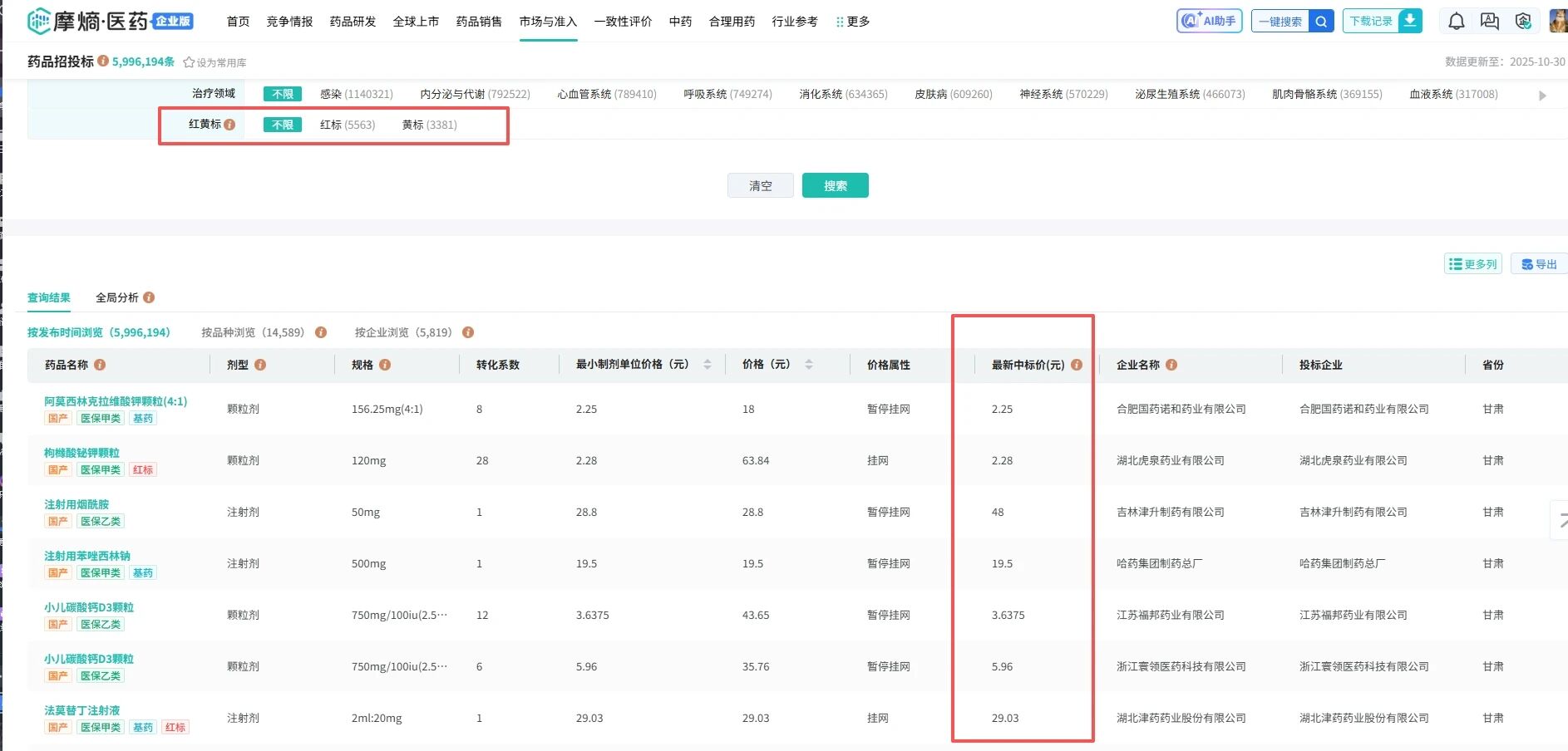 条件筛选功能新增【红黄标】和【最新中标价】筛选,用户可一键精准定位目标价格状态的药品,极大提升了数据筛选效率。