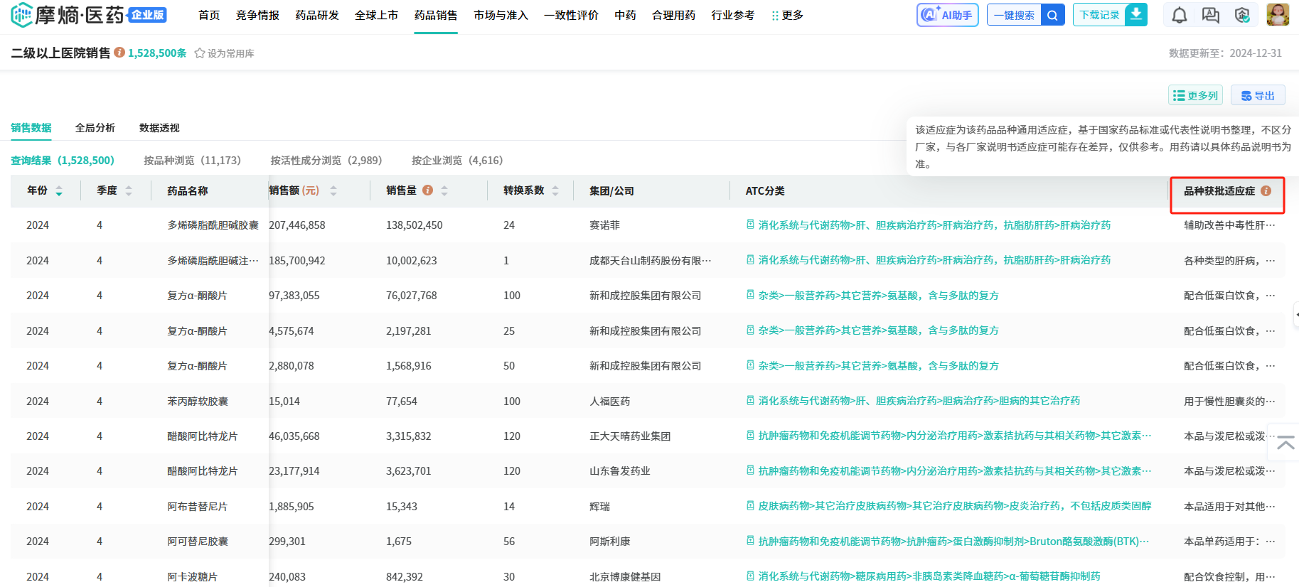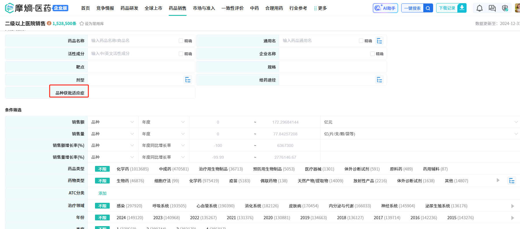 旗下的医院销售和药店销售子库统一新增了“品种获批适应症”检索字段及数据展示。该字段依据国家药品标准与代表性说明书整理,支持用户直接通过特定适应症查询相关药品的市场销售情况,从而为精准分析细分治疗领域提供关键数据支撑。