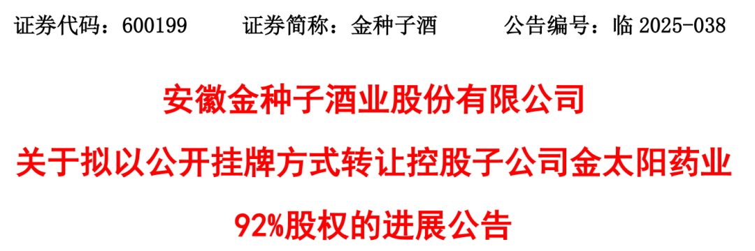 回溯来看,金种子酒剥离金太阳药业的意图十分迫切。据了解,金种子酒2024年4月启动了金太阳药业股权转让计划,2025年8月28日-9月24日首次公开挂牌,以接近1.4亿元的价格转让其92%股权,但最终流标。