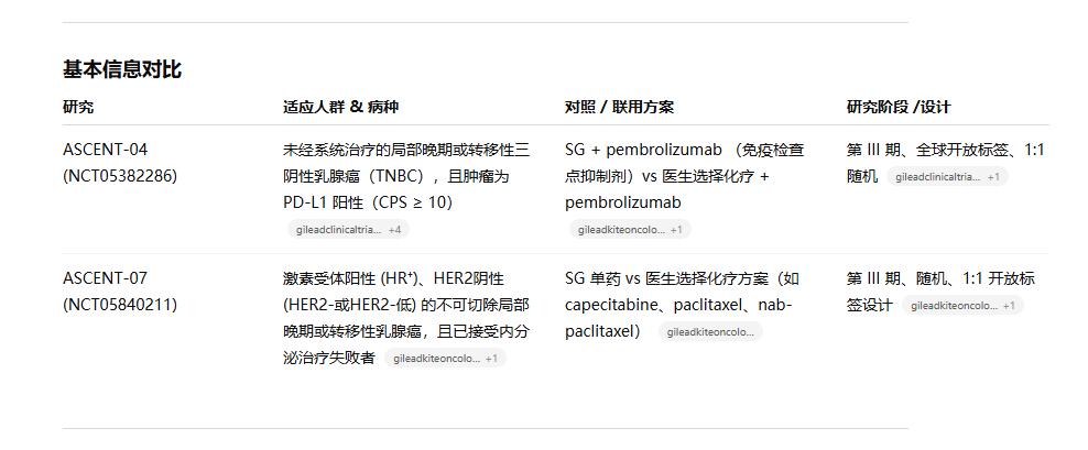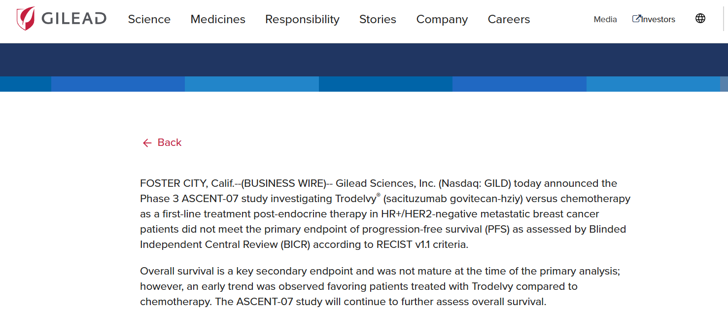 2025年11月7日,吉利德宣布 ASCENT-07 3 期研究失利, Trodelvy® ( sacituzumab govitecan-hziy)与化疗作为 HR+/HER2 阴性转移性乳腺癌患者内分泌治疗后一线治疗的疗效,结果显示,根据 RECIST v1.1 标准,由盲法独立中心审查 (BICR) 评估的无进展生存期 (PFS) 未达到主要终点。