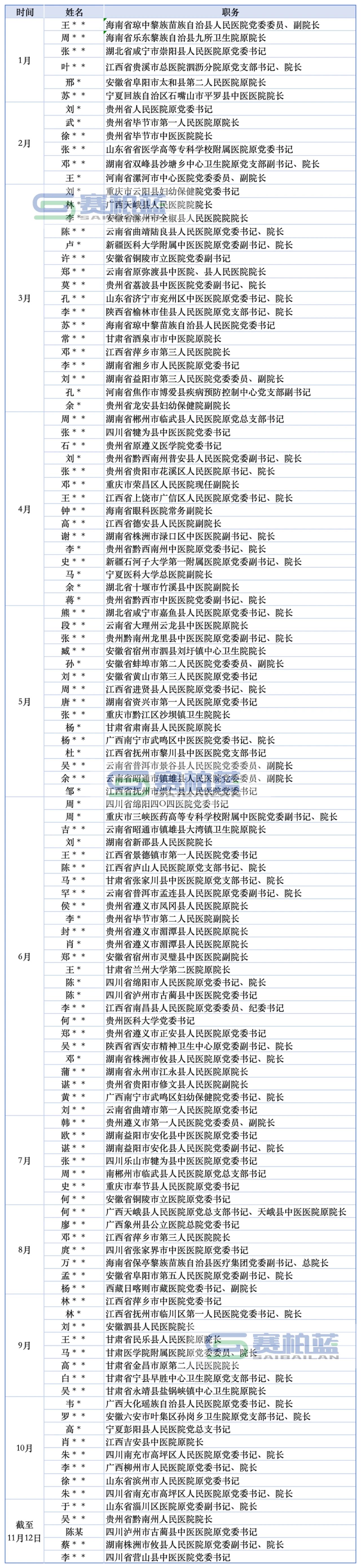 据赛柏蓝不完全梳理,从今年年初至今,至少已有近120名医院党委书记/院长/副院长相继落马(文末附名单)。