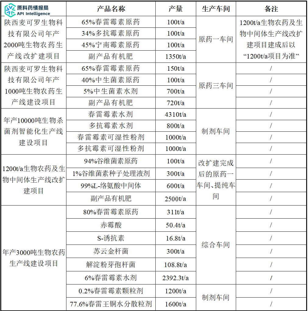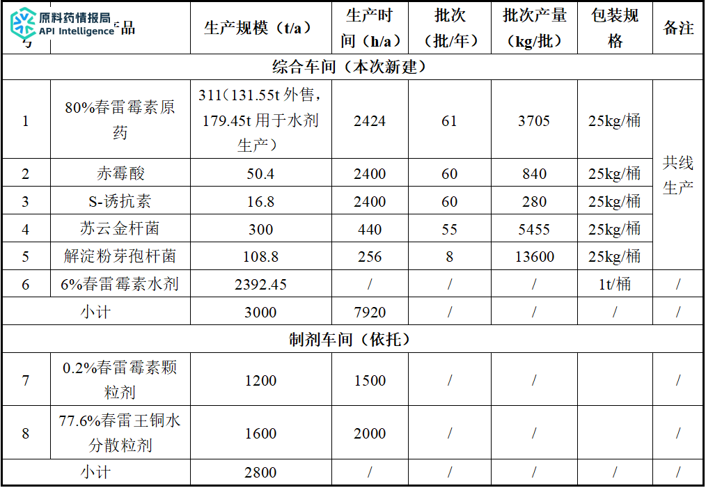 产品方案:311吨/年80%春雷霉素原药、50.4吨/年赤霉酸、16.8吨/年S-诱抗素、300吨/年苏云金杆菌、108.8吨/年解淀粉芽孢杆菌、2392.45吨/年6%春雷霉素水剂、1200吨/年0.2%春雷霉素颗粒剂、1600吨/年77.6%春雷王铜水分散粒剂。