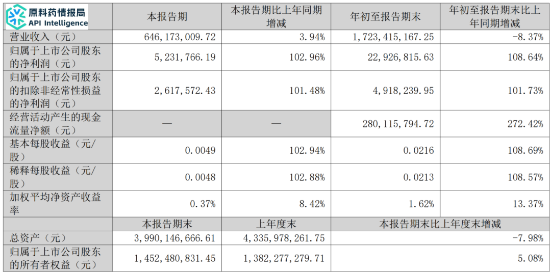 罗欣药业前三季度公司实现营业总收入17.23亿元,同比下降8.37%;归母净利润2292.68万元,同比扭亏;扣非净利润491.82万元,同比扭亏。