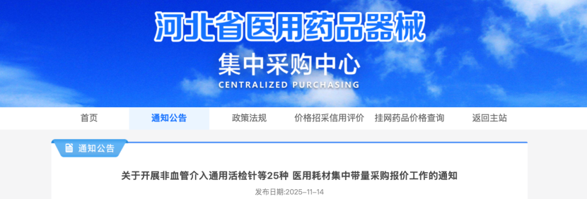 11月14日,河北省医用药品器械集中采购中心发布通知,将开展非血管介入通用活检针等25种医用耗材集中带量采购报价工作,报价时间为2025年11月20日9:00 - 15:00。
