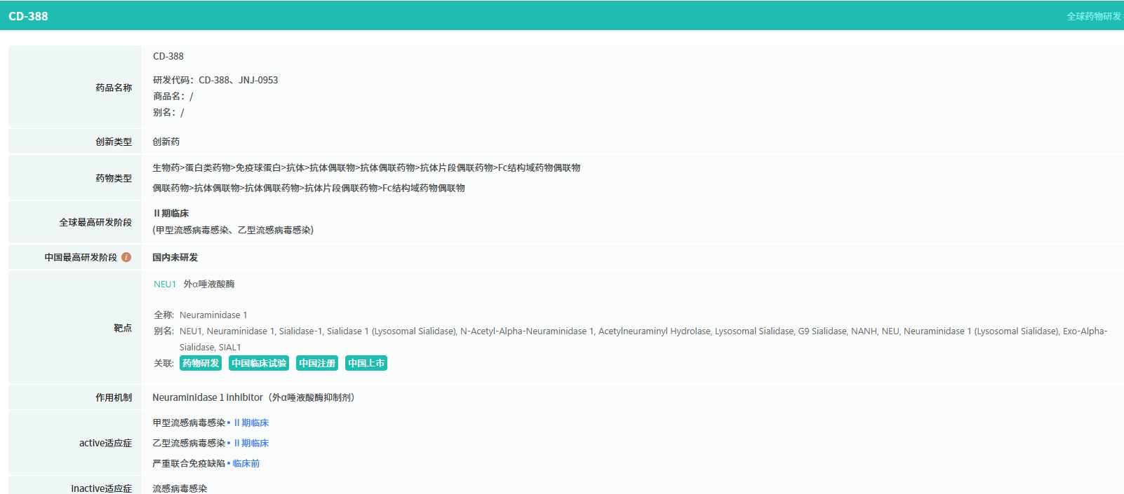 CD388 是Cidara管线核心候选药物,作为长效、广谱抗流感预防剂设计突破显著,它非疫苗也非单抗,而是将神经氨酸酶抑制剂与Fc片段偶联成低分子量生物制剂,不依赖人体免疫应答,对免疫低下人群有效,单次给药血液有效浓度可维持4 - 5个月,有望“一季一针”预防流感,且对甲、乙型流感均有抑制活性、不受病毒株变异影响。