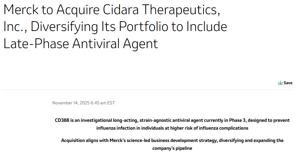 近日(11月14日),默沙东与生物技术公司Cidara Therapeutics共同宣布,双方已达成最终协议。根据该协议,默沙东将通过一家子公司以每股221.50美元的现金收购Cidara,交易总价值约92亿美元,将其核心在研流感预防药物 CD388 收入囊中。