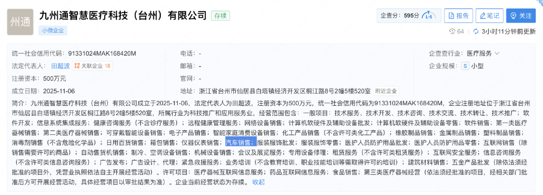 11月19日,赛柏蓝查询企查查数据显示,九州通智慧医疗科技(台州)有限公司于近日成立。该公司由九州通旗下九州通医疗健康科技有限公司全资持股,注册资本500万元,经营范围包含健康咨询服务(不含诊疗服务);远程健康管理服务;可穿戴智能设备销售;电子产品销售;汽车销售等。