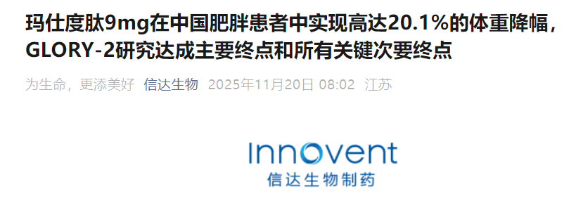 11月20日,信达生物宣布,玛仕度肽注射液(胰高血糖素[GCG] /胰高血糖素样肽-1[GLP-1] 双受体激动剂,研发代号:IBI362)在中国中重度肥胖人群中开展的III期临床研究(GLORY-2)达成主要终点和所有关键次要终点,信达生物将于近期向监管机构递交玛仕度肽9mg用于成人体重控制的新药上市申请。