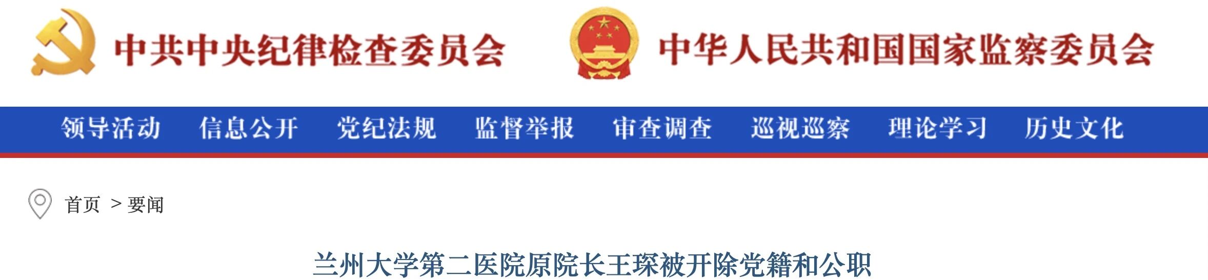 11月24日,中纪委发布通报,兰州大学第二医院原院长王琛被开除党籍和公职。