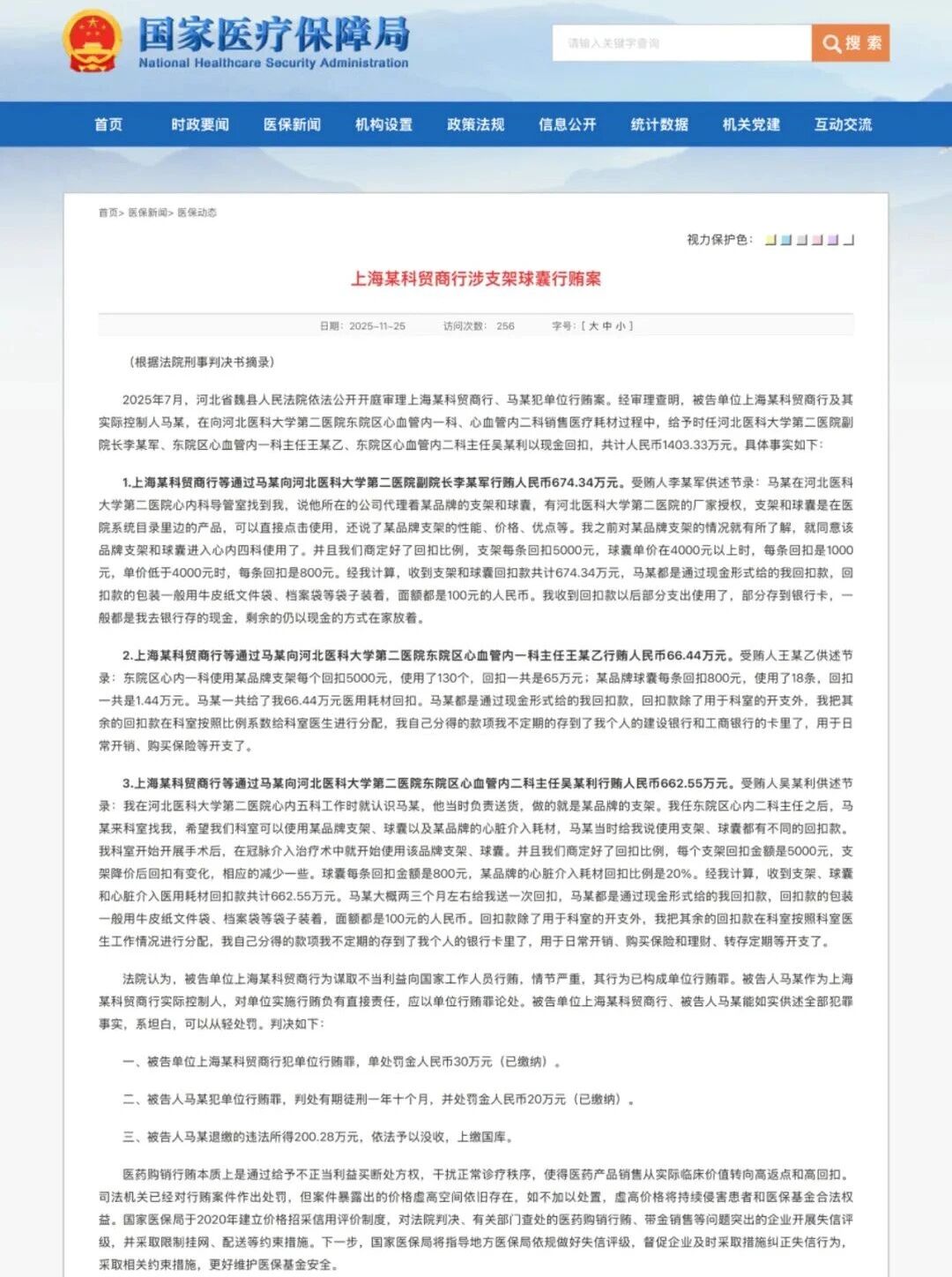 昨日(11月25日),国家医保局发布《上海某科贸商行涉支架球囊行贿案》,涉及一名医院副院长和两名科主任。