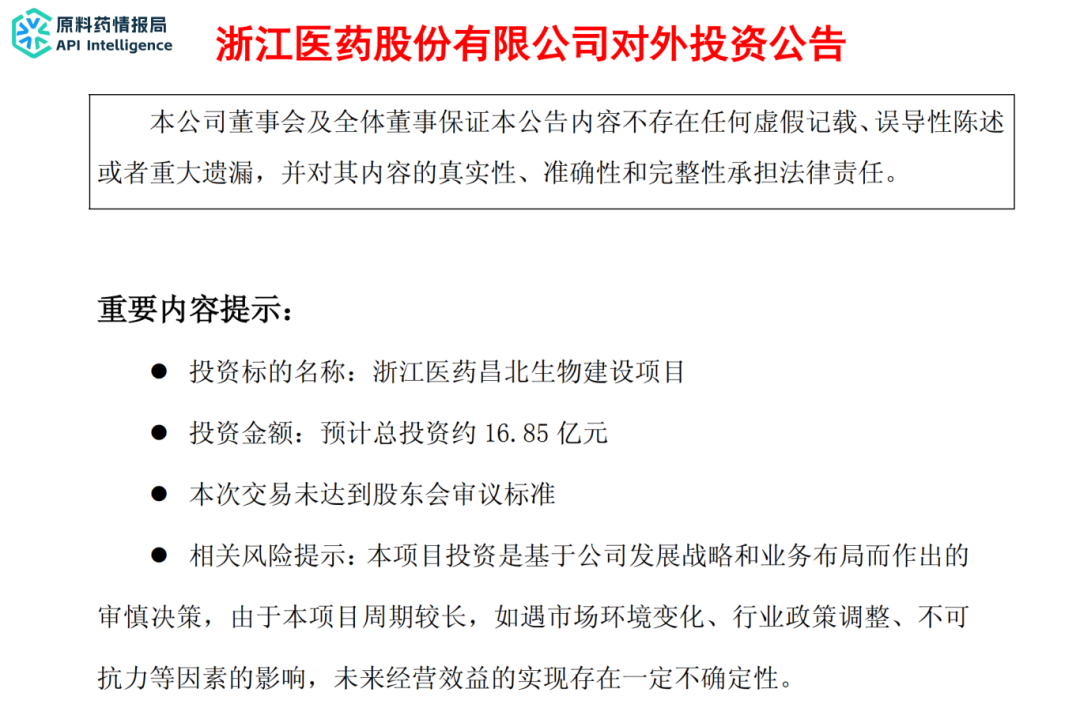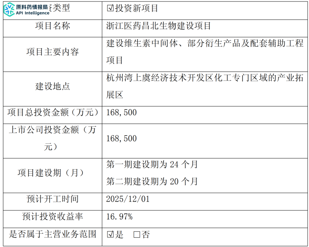 昌北生物为公司全资子公司,位于杭州湾上虞经济技术开发区化工专门区域的产业拓展区,土地面积为359亩,其中211亩实施一期规划和二期规划,剩余148亩土地为三期及以上规划。浙江医药昌北生物建设项目分两期建设,第一期建设时间为2025年12月至2027年11月,主要建设维生素中间体、部分衍生产品及配套辅助工程项目;第二期建设时间为2026年5月至2027年12月,主要建设以一期产品为原料的衍生产品以及配套辅助公用工程项目,扩大产品种类,提高产品的平台优势。浙江医药昌北生物建设项目总投资预计168,500万元。