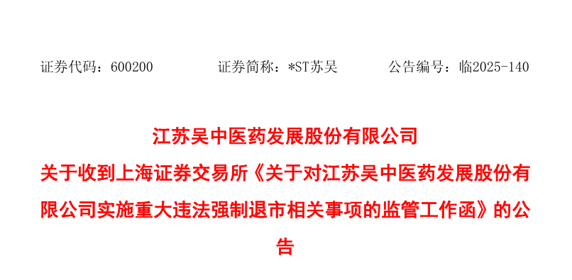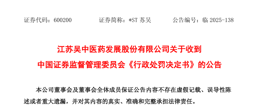 2025年11月26日,江苏吴中发布公告,公司收到上海证券交易所下发的《关于对江苏吴中医药发展股份有限公司实施重大违法强制退市相关事项的监管工作函》的公告》,同时因信息披露违规公司实控人被处以10年证券市场禁入、罚款1500万,公司被处罚1000万。