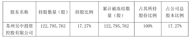 截止目前,苏州吴中投资控股有限公司所持公司122,795,762股股份已全部处于质押/司法标记/司法冻结/轮候冻结状态,截至本公告披露日,控股股东所持公司股份累计被冻结(包括司法冻结、司法标记、轮候冻结)情况如下: