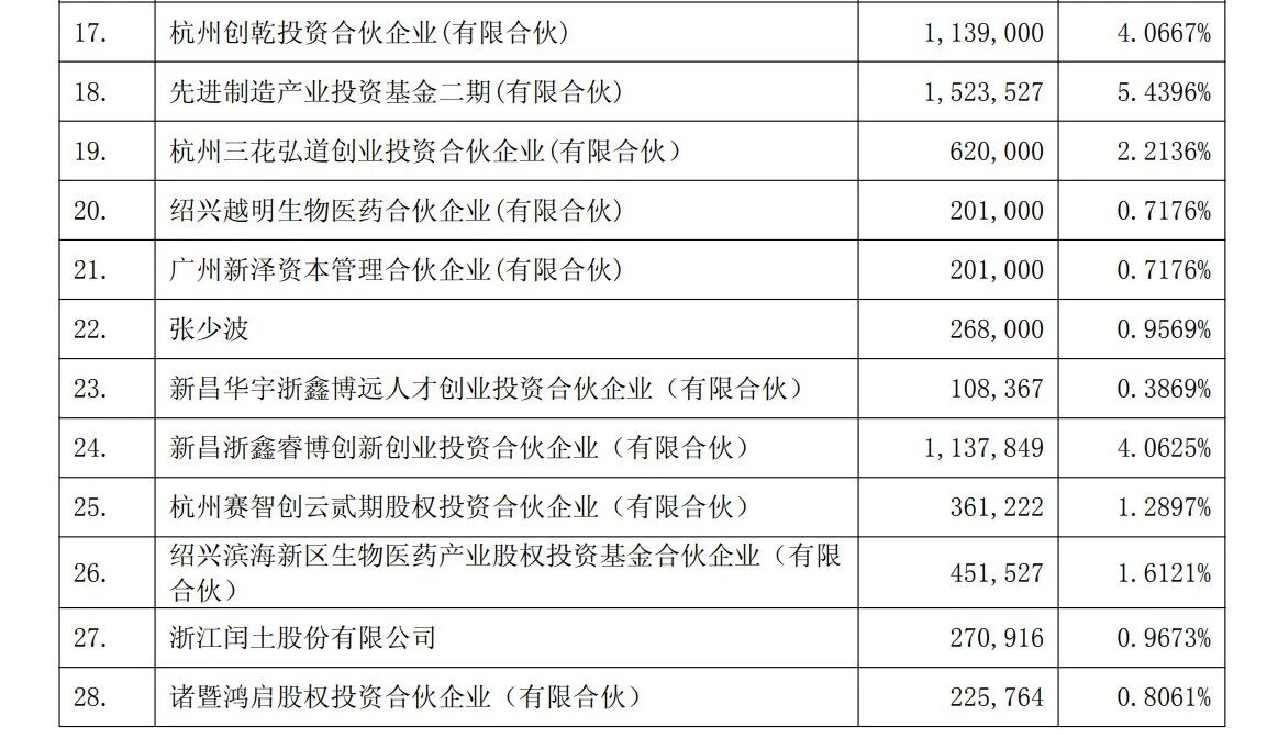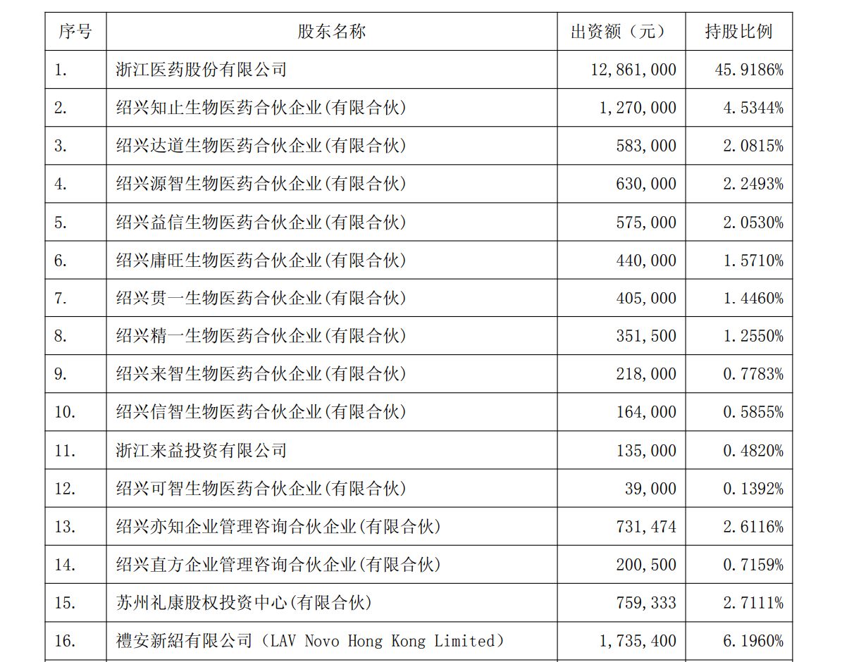 截至目前,新码生物股东共有30个,其中浙江医药及其控股子公司来益投资公司合计持有新码生物公司46.27%股权,其余股东包括多家生物医药合伙企业与投资机构,如苏州礼康股权投资中心、德安新超有限公司、先进制造产业投资基金二期等,最高持股比例不超过6.20%。