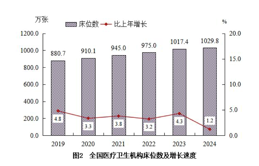 2024年末,全国医疗卫生机构床位1029.8万张,其中:医院812.0万张(占78.8%),基层医疗卫生机构182.9万张 (占17.8%),专业公共卫生机构32.7万张(占3.2%)。医院中,公立医院床位占69.0%,民营医院床位占31.0%。